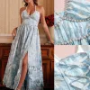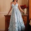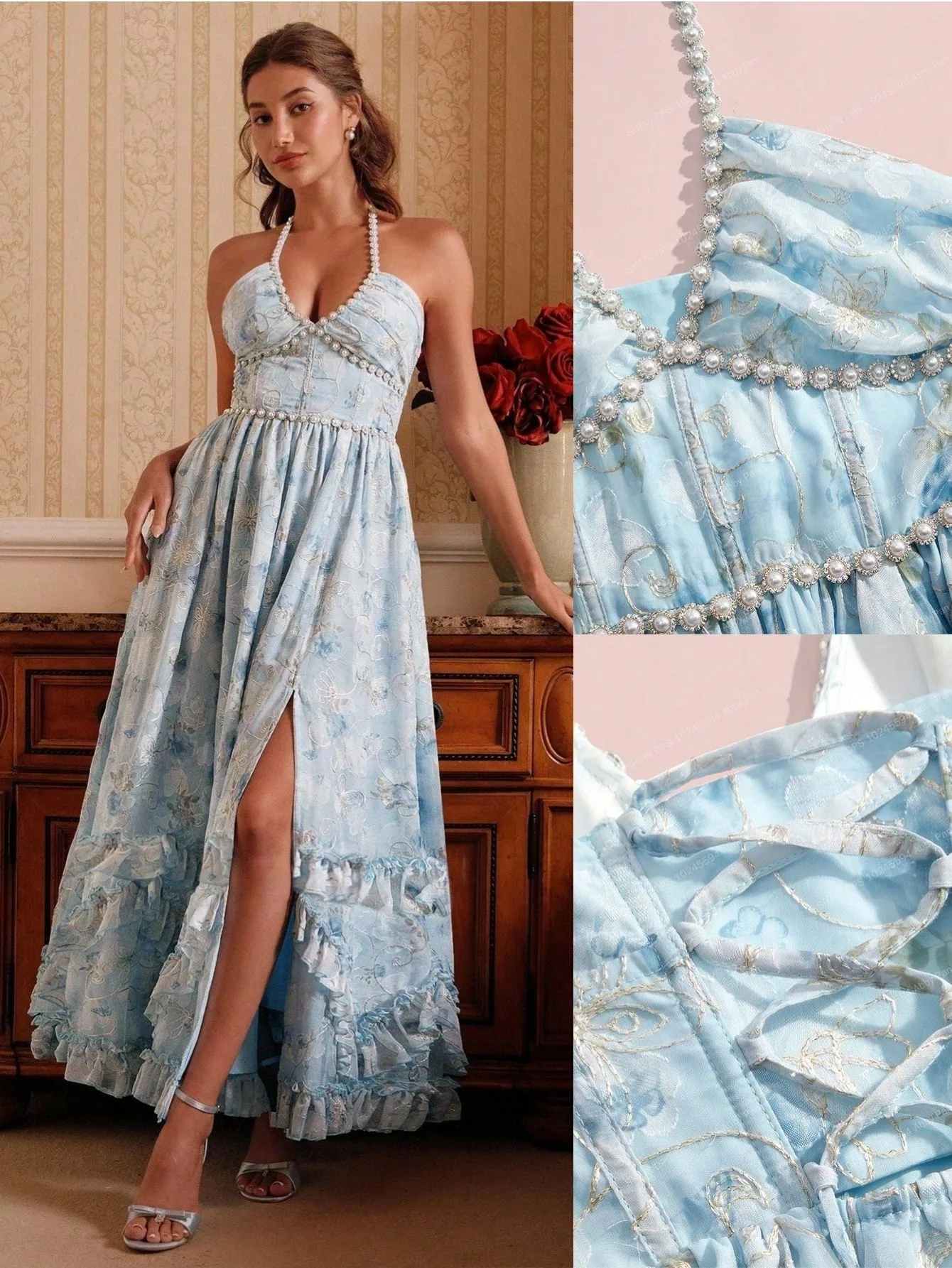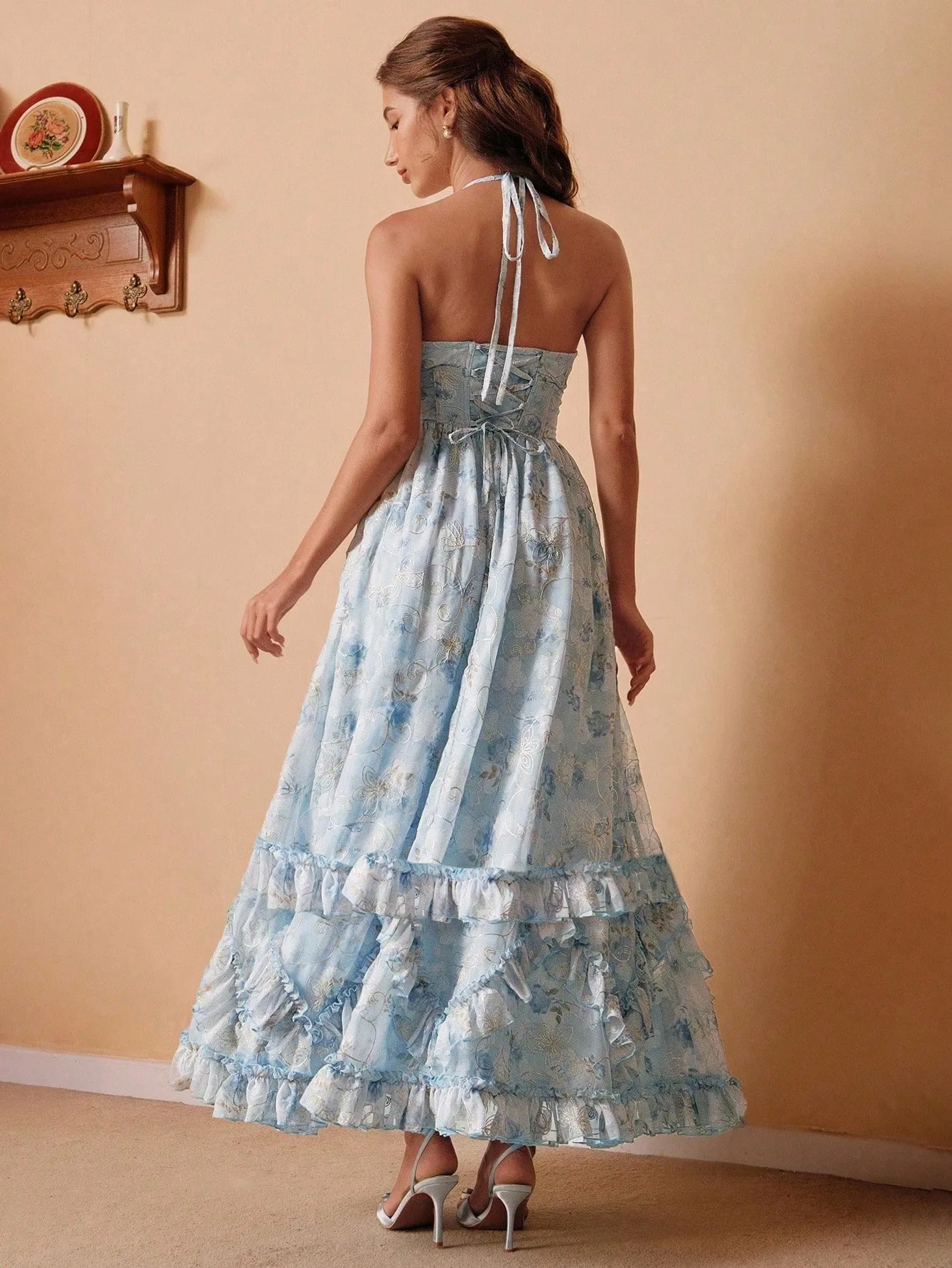 Soft and romantic, this Blue Halter Neck Ruffle Maxi Dress features a flowing silhouette with delicate floral detailing and ruffled accents. Its structured bodice and airy skirt create an elegant balance of shape and movement.