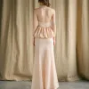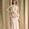 Step into timeless sophistication with our Blush Elegance Sheer Peplum Maxi Dress, a bold fusion of allure and elegance. Designed for evening occasions, this dress flatters the figure with its daring deep V-neckline and halter-style straps. The cinched waist is accentuated by a voluminous peplum detail, adding shape and drama before flowing into a sleek maxi skirt.