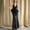 Step into timeless sophistication with our Midnight Elegance Sheer Peplum Maxi Dress, a bold fusion of allure and elegance. Designed for evening occasions, this dress flatters the figure with its daring deep V-neckline and halter-style straps. The cinched waist is accentuated by a voluminous peplum detail, adding shape and drama before flowing into a sleek maxi skirt.