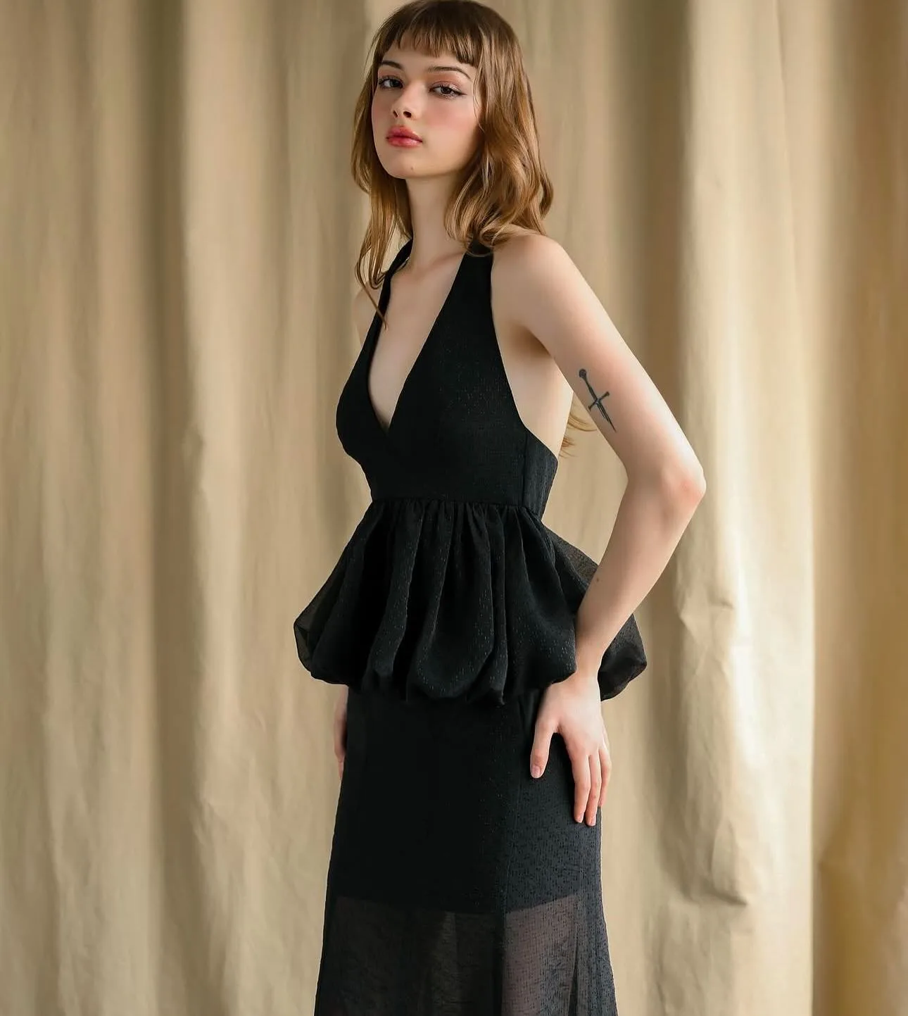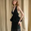 - Deep V-neckline with halter straps for a sultry yet elegant look