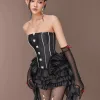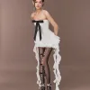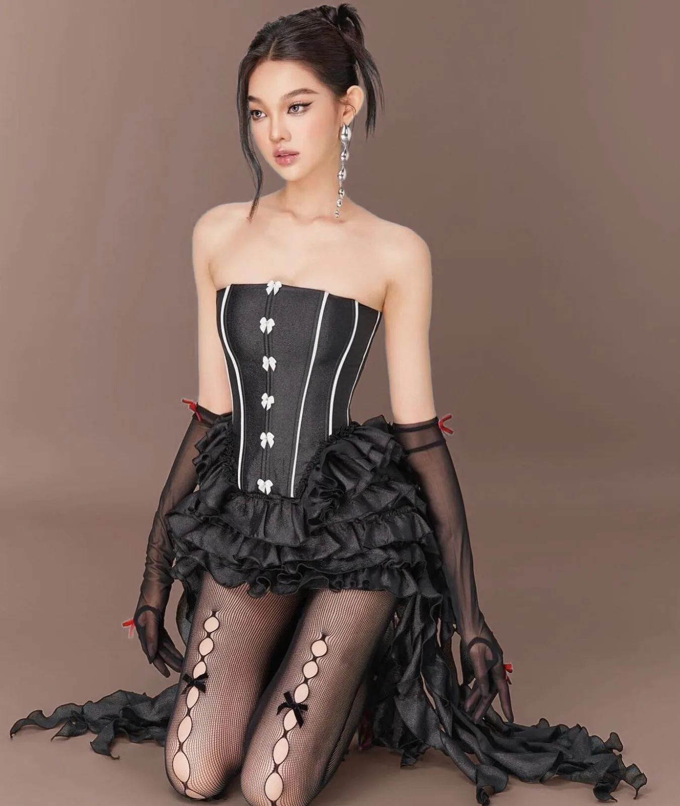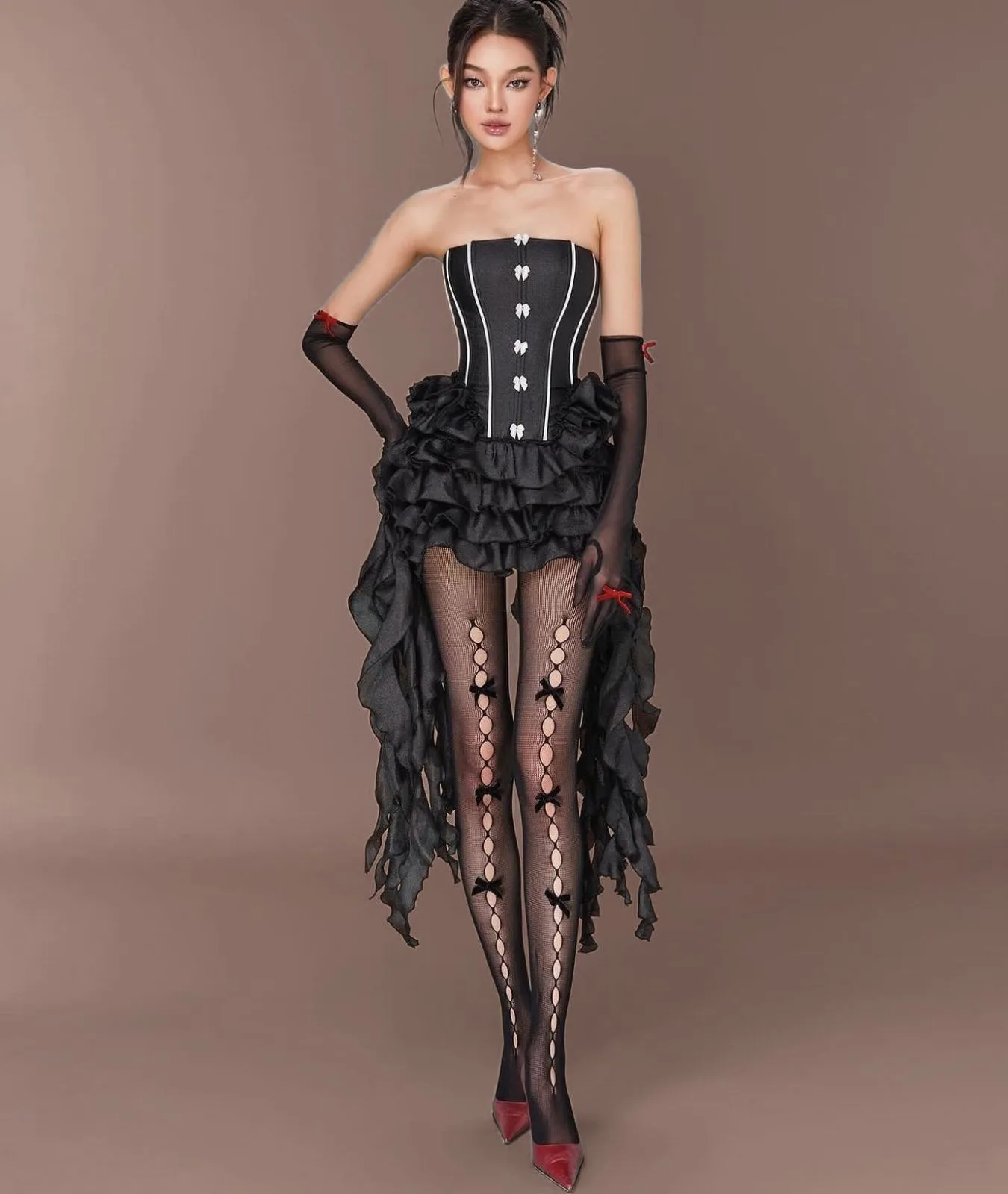 Fierce yet feminine, this dress combines a structured corset with cascading ruffles. White piping and mini bows add contrast, while tiered textures bring dramatic volume.