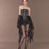 - Details: Corset bodice with boning, bow embellishments, layered ruffle skirt, chiffon draped streamers