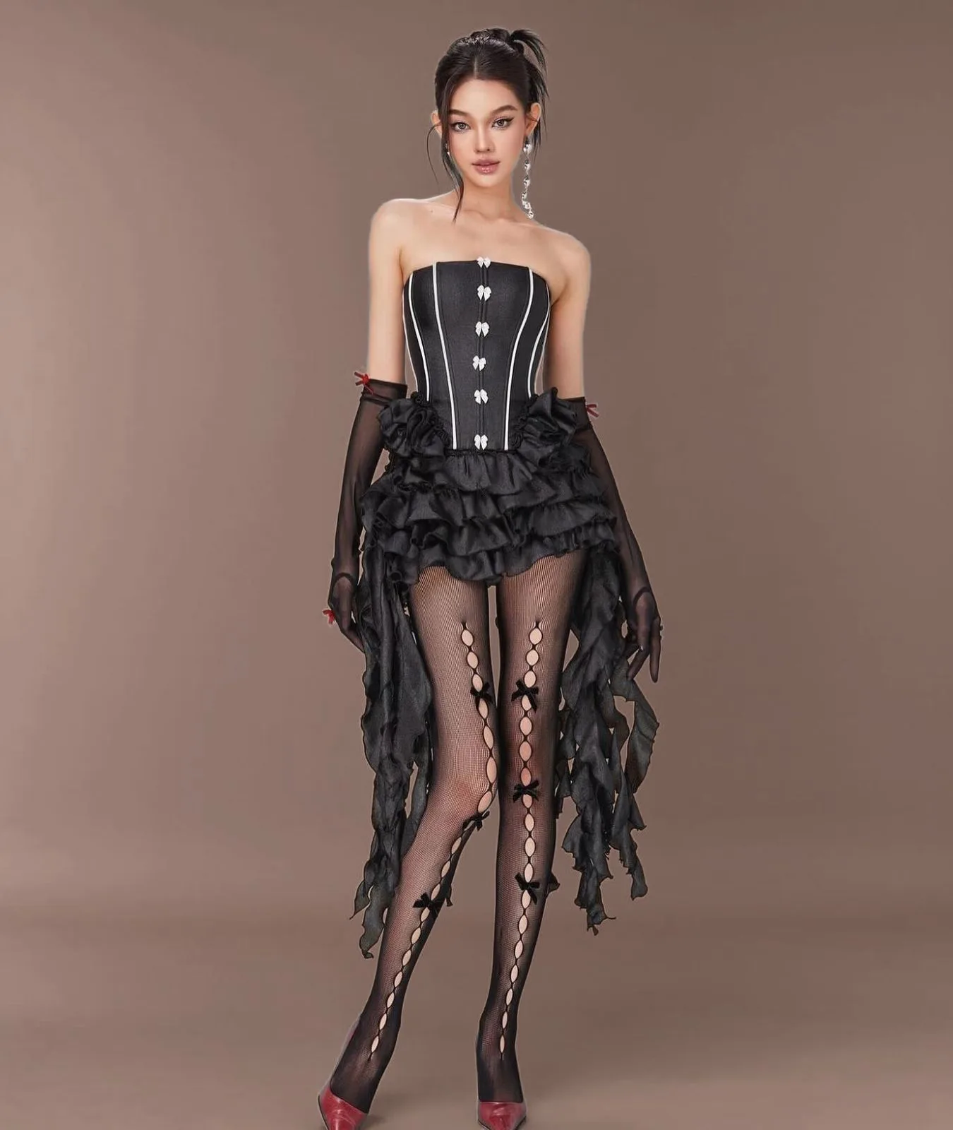 This bold strapless dress combines a corset-inspired bodice with a layered ruffle mini skirt, creating a dramatic and structured silhouette. The fitted top features vertical piping and dainty bow accents, enhancing the feminine design, while the voluminous ruffles at the skirt bring playful movement and edge.