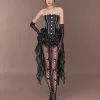- Details: Lace corset bodice with boning, lace skirt, chiffon side drape with ruffle extension