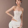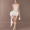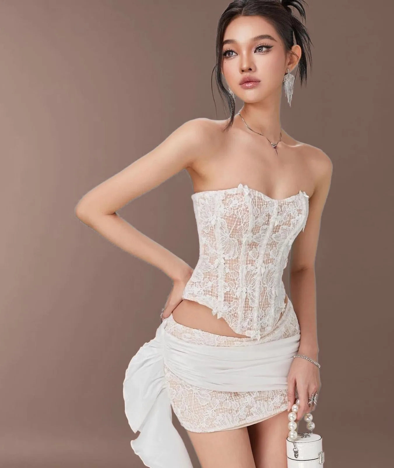 Effortlessly elegant, this strapless white mini dress pairs a structured lace corset bodice with a fitted lace skirt. A draped chiffon overlay cinches at the side, flowing into a cascading ruffle detail for a touch of drama. The romantic lace meets modern tailoring, creating a piece that’s both delicate and striking.