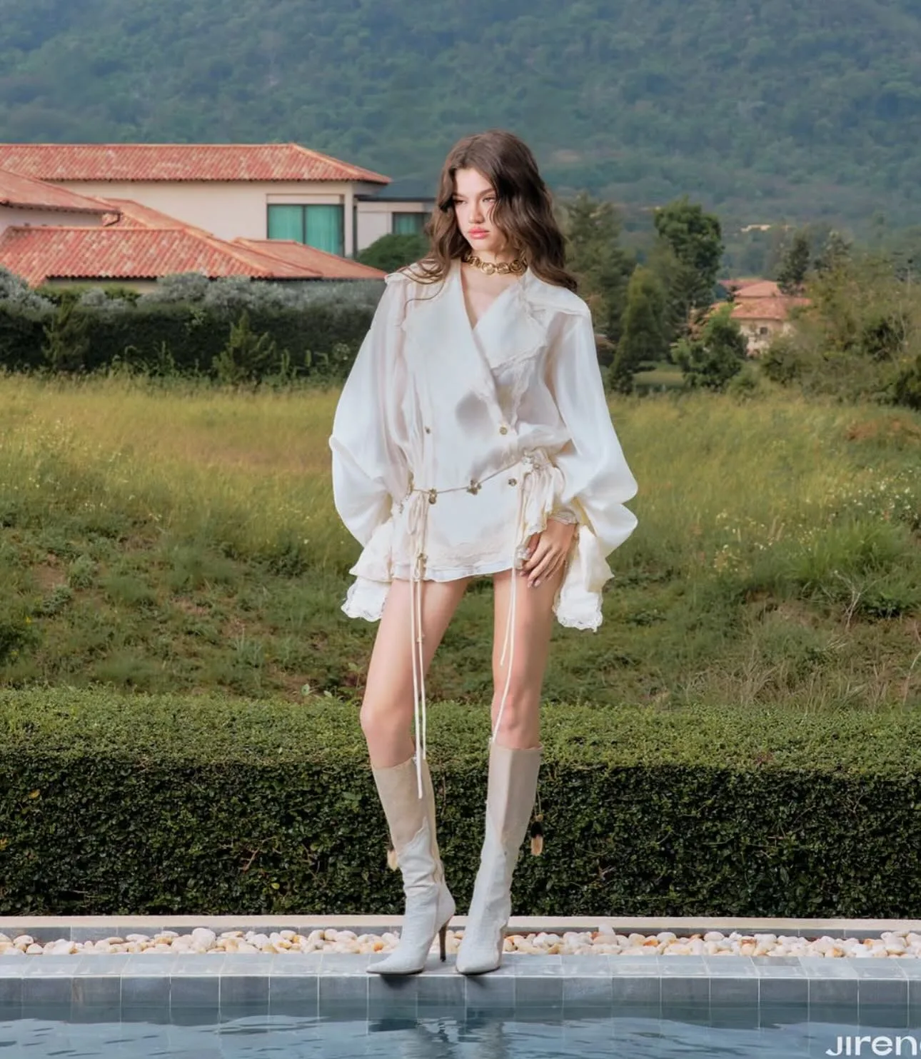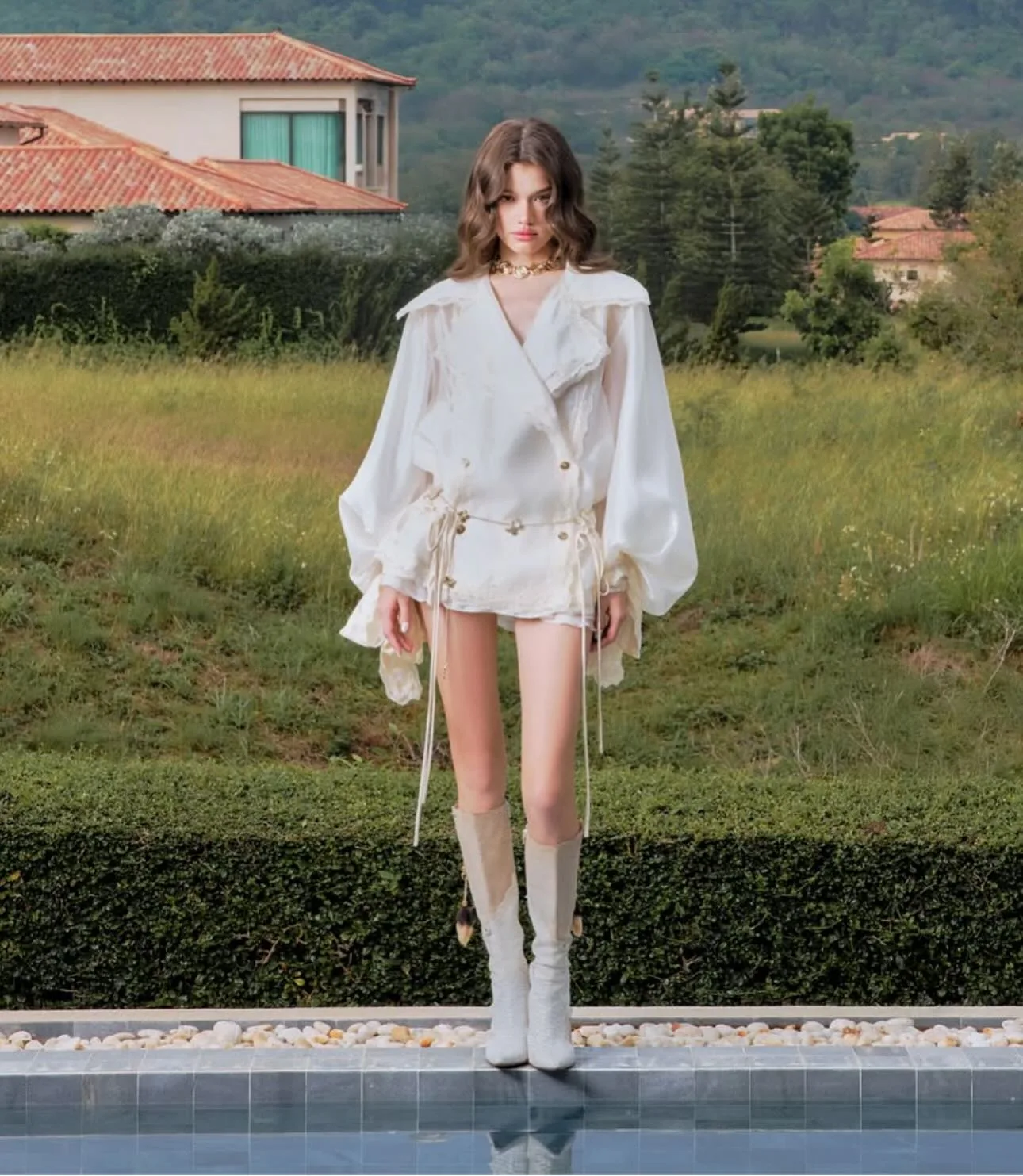 This ivory wrap-style mini dress brings together elegance and modern charm. Designed with voluminous bishop sleeves, adjustable waist ties, and delicate button details, it creates a striking yet feminine silhouette. The lightweight fabric drapes beautifully, while the short hemline adds a bold, fashion-forward touch. Perfect for making a statement at special occasions or chic outings.